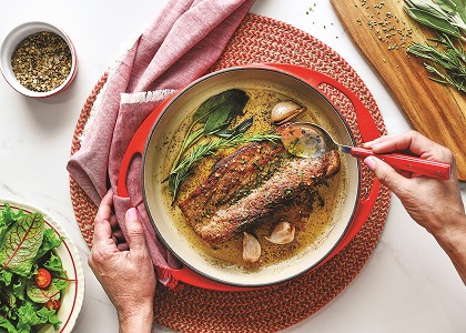 Cast iron helps distribute heat evenly, creating a golden brown crust on your pork. Whether cooking chops or tenderloin, this steady heat helps lock in juices and build rich, caramelized flavour. Plus, it easily transfers from stovetop to oven for beautiful, evenly cooked results.