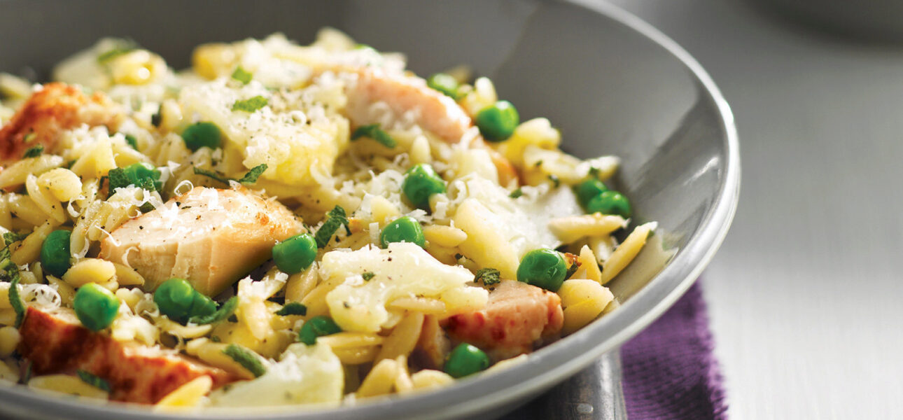 In a large deep skillet, heat oil and butter over medium-high heat. Add garlic paste and cook until fragrant, about 30 sec. Add cauliflower and cook until tender and golden, about 5 min. Add orzo and bay leaf and stir until just coated with oil and butter. Add broth and cook, stirring often, until orzo is al dente and most of the liquid has been absorbed, about 12 min. Stir in peas, Parmesan and chicken and cook 1 min. Season with salt and pepper.