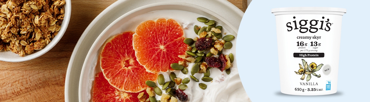 Spoon the desired amount of Siggi’s 3.25% vanilla skyr yogurt from the tub into bowls and top with granola.