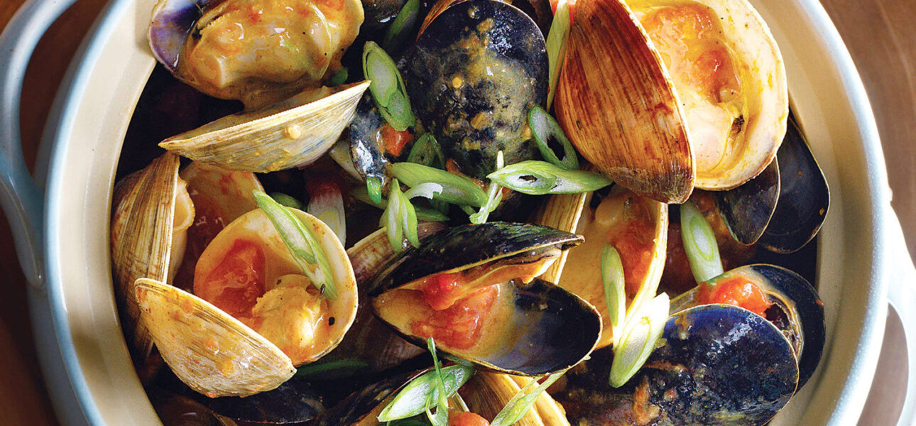 Spoon mussels and clams onto a large serving platter or into a bowl; spoon sauce overtop and garnish with green onions.